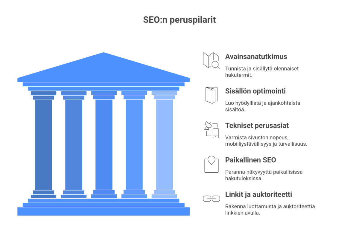 Hakukoneoptimoinnin ytimessä on yksinkertainen ajatus: kun potentiaalinen asiakas kirjoittaa Googleen kysymyksen tai avainsanan, haluat sinun sivusi olevan se, joka tarjoaa parhaan vastauksen. Esimerkiksi stressinhallintavalmentaja haluaa löytyä, kun käyttäjä hakee ”stressinhallintavalmennus” tai kysyy ”miten vähentää stressiä töissä”. SEO koostuu muutamasta peruspilarista: