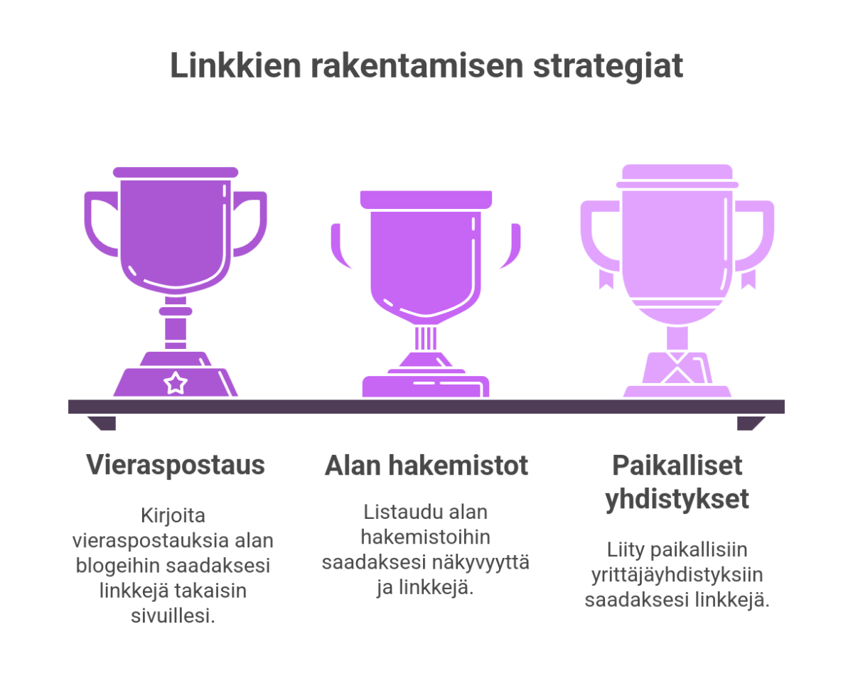 - Linkit ja auktoriteetti: Netissä luottamus rakentuu myös linkkien kautta. Kun joku muu sivusto linkkaa sinun sivuillesi, Google ajattelee että sivusi on tärkeä (vähän kuin tieteellinen viite – suositus). Valmentajalle käytännön keinoja hankkia linkkejä ovat esim. kirjoittaa vieraspostaus johonkin alan blogiin (ja saada linkki takaisin sivuillesi), listautua alan hakemistoihin (Coaching Circle, Suomen Coaching-yhdistyksen jäsenhakemisto tms.), tai vaikkapa paikallisen yrittäjäyhdistyksen sivuille. Nämä linkit paitsi tuovat suoria kävijöitä myös kohottavat sivujesi “auktoriteettia” Googlen silmissä, mikä parantaa hakusijoituksia (isommilla, tunnetuilla sivustoilla on yleensä korkea auktoriteetti, mutta pienikin voi nousta niche-aiheessa hyvien sisältöjen ja linkkien avulla).