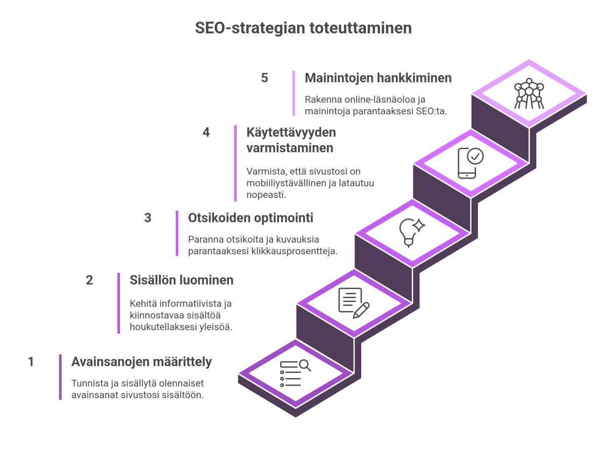 Pienillä askelilla – lisäämällä avainsanoja tekstiisi, julkaisemalla hyödyllistä sisältöä ja huolehtimalla sivustosi perusasioista – pääset jo pitkälle. Et välttämättä nouse huomenna Googlen ykköseksi kilpaillulla sanalla, mutta löydyt ehkä muutamalle oikeasti relevantille hakijalle. Ja joskus se yksi oikea hakija voi muuttua pitkäaikaiseksi asiakkaaksi.