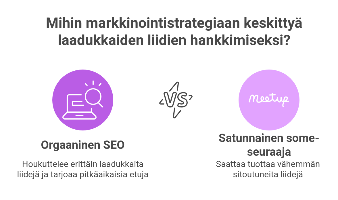 Orgaaninen (ilmainen) näkyvyys hakukoneissa tuo sinulle erittäin laadukkaita liidejä. Ihminen joka löytää sivusi googlaamalla omaa ongelmaansa, on jo valmiiksi kiinnostunut ratkaisusta – hän saattaa olla paljon lähempänä maksavan asiakkaan polkua kuin esimerkiksi satunnainen some-seuraaja.